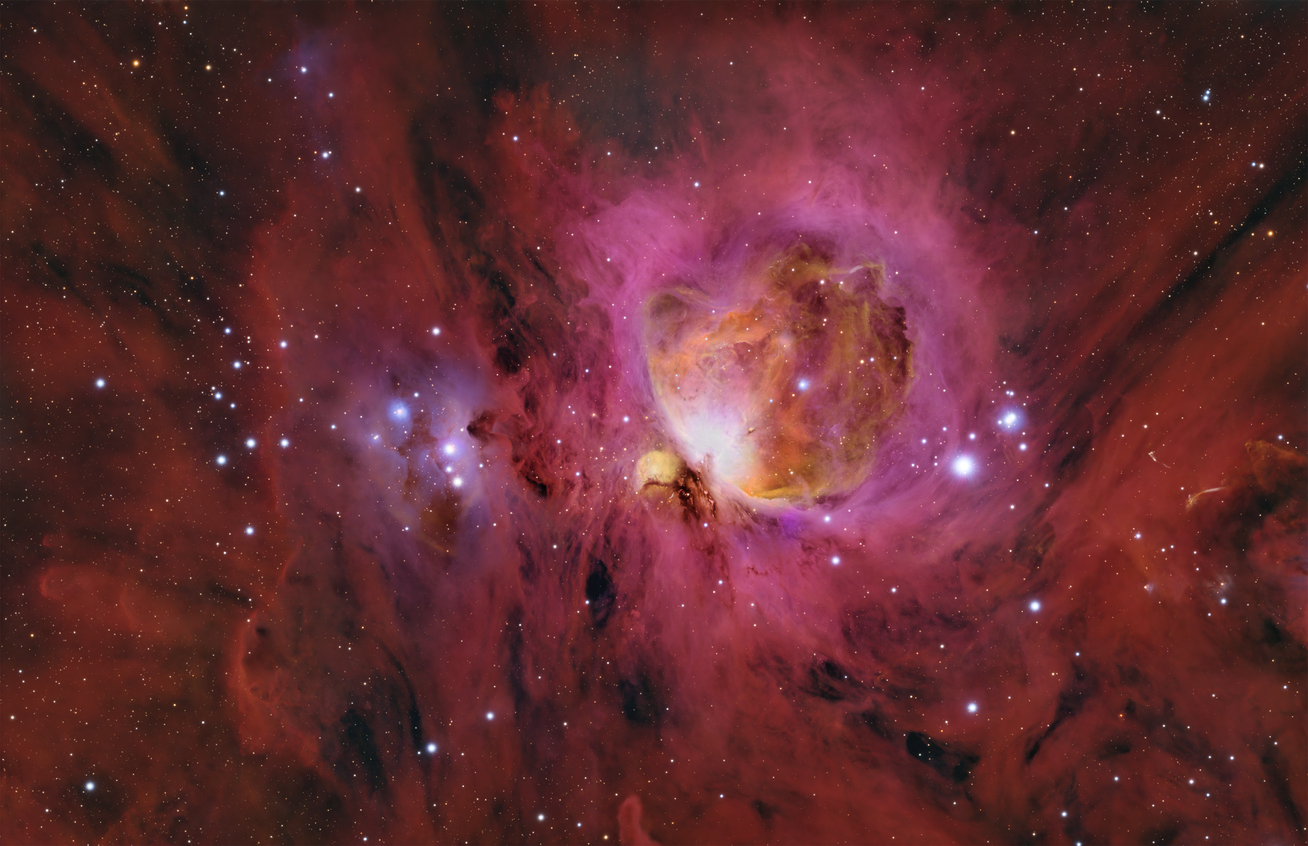 After over a dozen different multi-night sessions on M42 over the years, this was the first time I’ve captured the bow shock structure near IC 428 on the right side of the frame. It appears as a delicate arc—the result of a fast-moving star plowing through the interstellar medium and compressing the gas ahead of it. Think of it like a boat creating a wake, except this wake is light-years across and carved through tenuous clouds of hydrogen and dust.