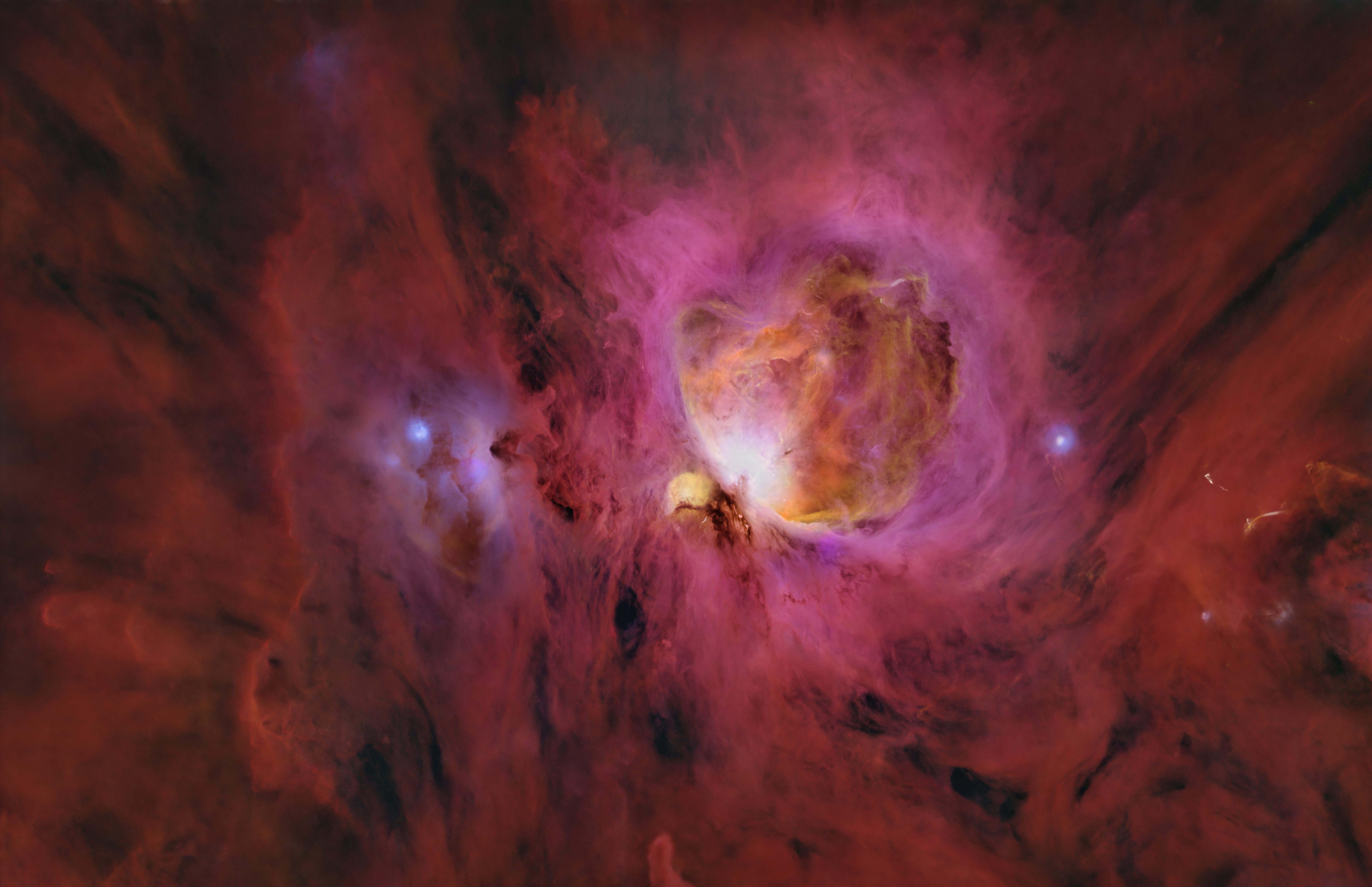 M42 sits just 1,350 light-years from Earth, making it one of our closest stellar nurseries. The brilliant core is dominated by the Trapezium Cluster—four massive young stars (θ¹ Orionis A, B, C, and D) that pump out intense ultraviolet radiation, ionizing the surrounding hydrogen gas and causing it to glow. These stars are incredibly young in cosmic terms—only about 300,000 years old, compared to our 4.6-billion-year-old Sun.